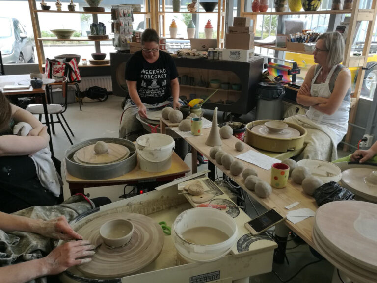 We hebben 10 draaischijven in de pottenbakkerij waar aan gewerkt kan worden. Iedereen heeft tijdens deze cursus de beschikking voor een eigen draaischijf en werktafel.