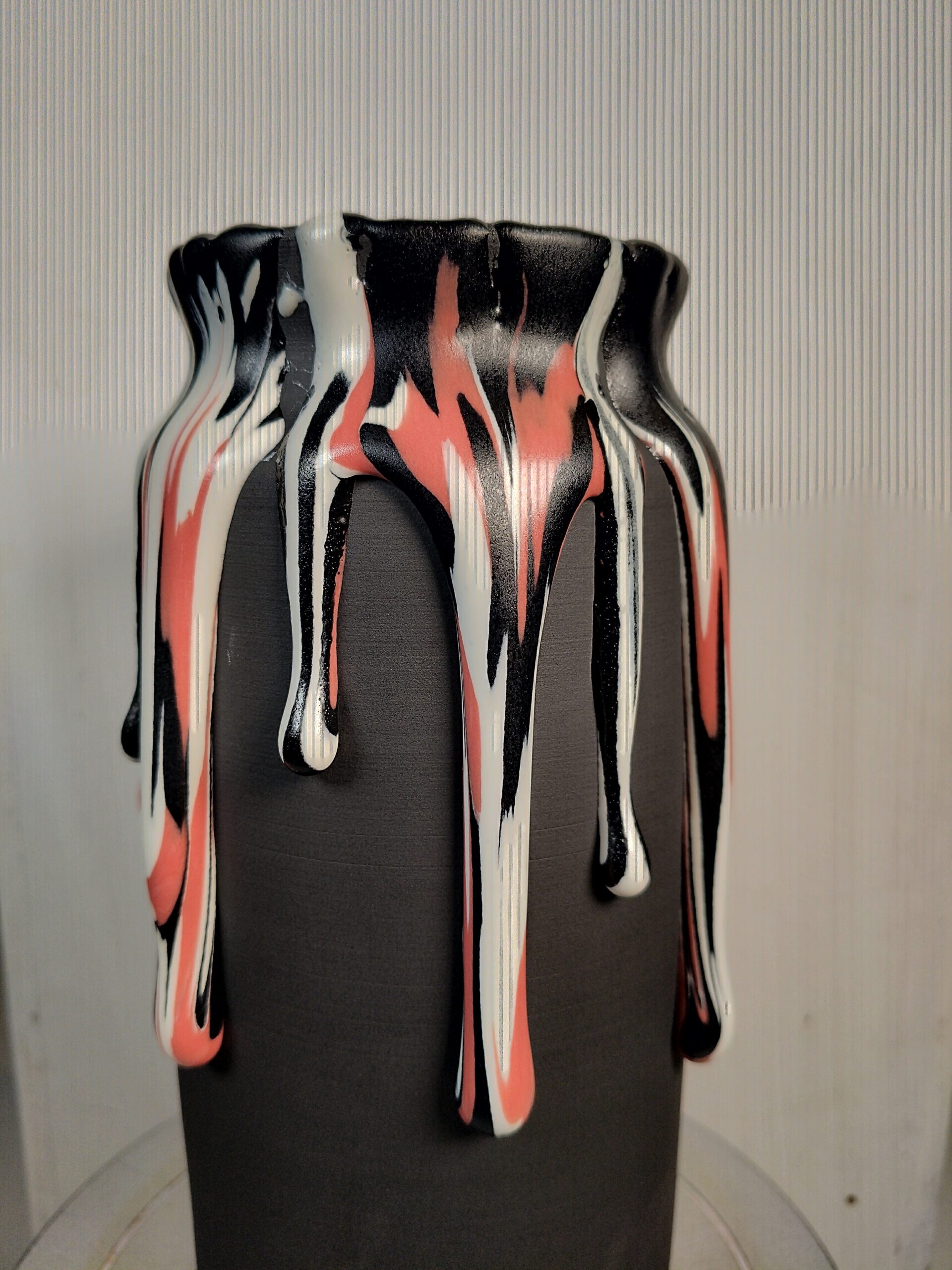 We hebben de afgelopen weken verschillende kleuren uitgeprobeerd. Kleine stipjes blijven mooi rond en strak. Grotere druppels laten meer beweging zien en geven een soort hangend effect. Vooral op verticale stukken werkt dit goed. Op een schaal of wandwerk kun je er juist een mooi patroon van maken zonder dat het uitloopt.
